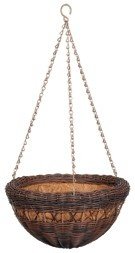Part of the beauty of hanging flowers is the planter that holds them. the resin wicker hanging basket with chain hanger has the traditional appearance of wicker, but it's actually made of a durable, weather-resistant pvc resin. the resin is hand-woven on a sturdy powder-coated metal frame for extra stability and long-lasting resilience. ideal for outdoor use, the resin material will stand up to the elements as it provides a happy home for your plant. the basket is available in two sizes and various colors and includes a coco fiber liner for healthy drainage. ready for planting, this attractive basket comes with a metal chain hanger for easy installation.